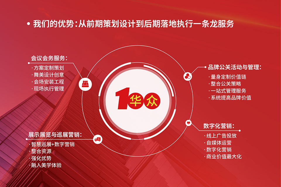 華眾傳媒集團(tuán)是在大數(shù)據(jù)網(wǎng)絡(luò)和新消費(fèi)交互時代為企業(yè)及其品牌全面賦能的營銷戰(zhàn)略公關(guān)公司。華眾傳媒集團(tuán)成立于2006年,總部設(shè)在青島,在北京、上海、廣州建立分公司,公司云集數(shù)百名公關(guān)、數(shù)字、營銷、設(shè)計等業(yè)界精英人才,旗下隸屬分公司有:北京華友世紀(jì)文化傳媒有限公司、上海天諾盛世廣告策劃有限公司和青島華和影視文化傳媒有限公司等多家子公司。公司積累了豐富的數(shù)字媒體、政府、時尚、圈層KOL等行業(yè)資源,服務(wù)項目輻射全國。業(yè)務(wù)范圍包含品牌公關(guān)活動與管理、數(shù)字化營銷、自媒體運(yùn)營、影視傳媒制作、品牌巡展、網(wǎng)紅快閃店等多個板塊,涵蓋公關(guān)傳播與整合營銷的完整產(chǎn)業(yè)鏈。